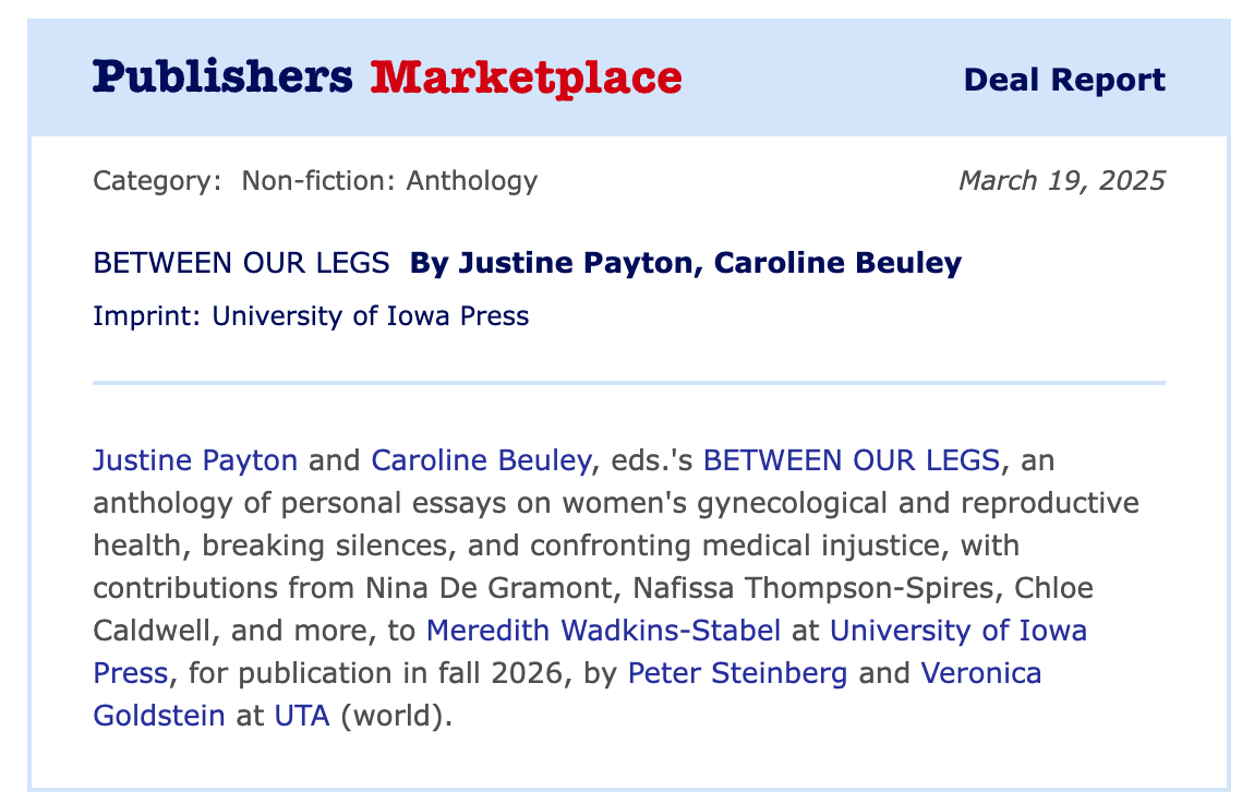 Between Our Legs: Silence-Breaking Stories on Gynecological Health is forthcoming from University of Iowa Press Fall 2026.